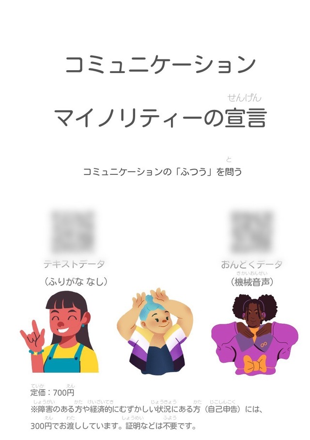 『コミュニケーションマイノリティの宣言』は、 この社会で「あたりまえ」とされているコミュニケーションのルールを問いなおすZINEです。 声の出し方、会話のテンポ、話す内容、表情、文法、言語…… たくさんの「ふつう」が、コミュニケーションマイノリティをしんどくさせている。 このZINEは、そうしたたくさんの「ルール」のばかばかしさをひとつずつ見つめ、 「わたしたちはちがっていい」 「声のかたちはひとつじゃない」 と宣言します。 テキストデータと音読データのQRコードつきです。 著者:睡 A5サイズ、22ページ。2025年5月23日刊行。 定価は700円ですが、障害のある方や、経済的にむずかしい状況にある方には300円で提供しています(証明などは不要です)。こちらは300円のページです。