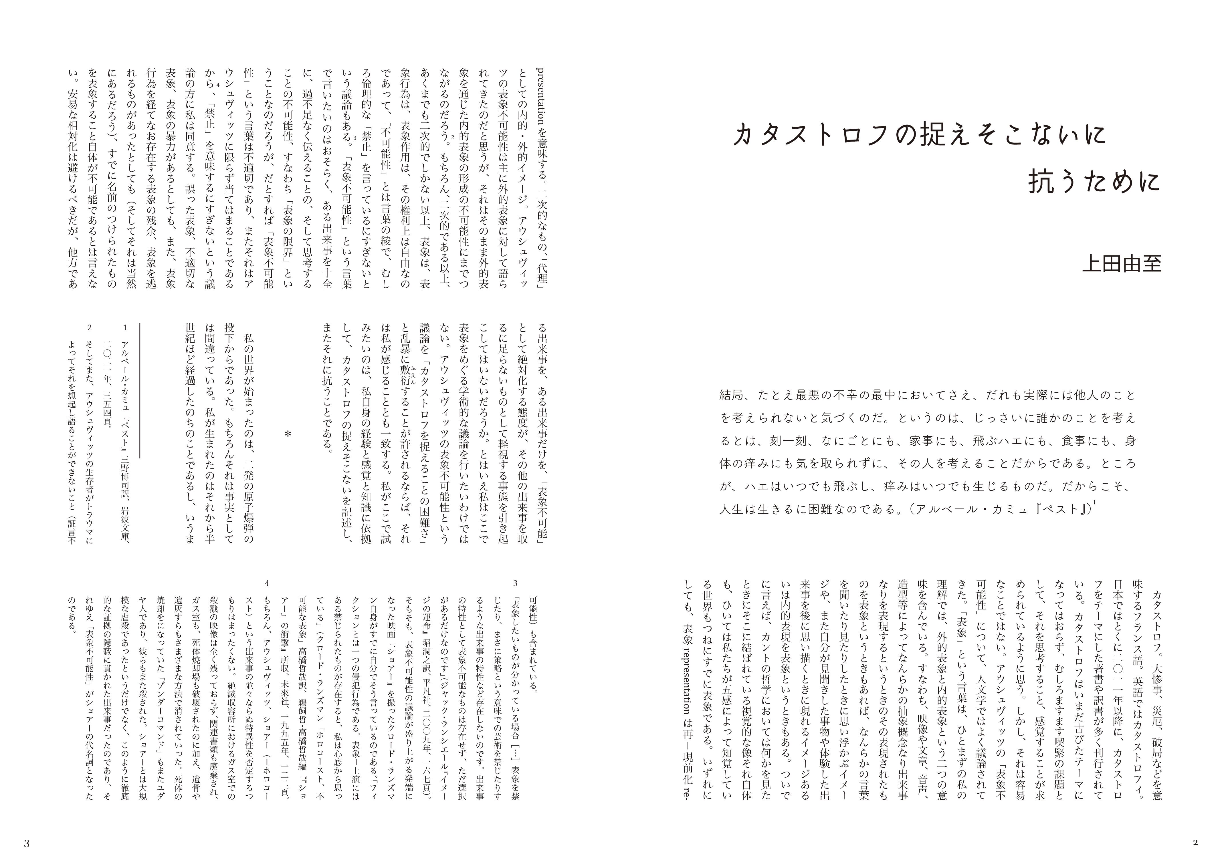 『路上の抵抗誌』の第二号。特集は「カタストロフと路上」。戦争や災害などのさまざまなカタストロフ(大惨事)に対して、それぞれの異なる立場から見たことや考えたことについての寄稿やインタビューを収録。本文モノクロ。